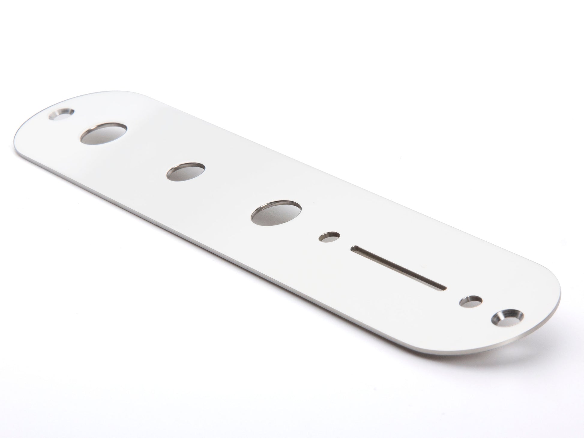 So save yourself the hassle. Callaham's plates are not plated in the first place, they're solid 416 stainless steel that's been polished to a mirror finish. So you never need to worry about any plating flaking loose, and plus the hole is drilled exactly where it needs to be because, you know, Callaham is a machine shop! The 416 stainless steel looks like nickel, so if you want knobs that match the finish, be sure to check out our ToneShaper nickel-plated Tele knobs!