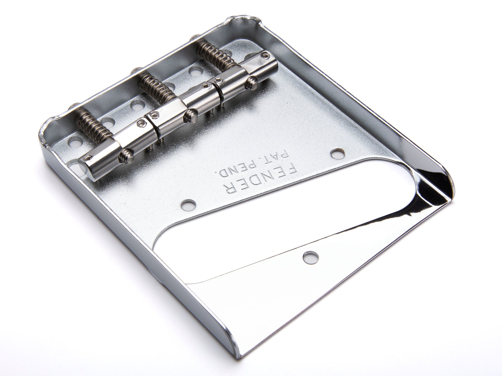 This is the traditional Tele bridge, made in house by Fender since 1950. Of course the major problem with this bridge since the beginning is that the traditional saddles were not compensated, so the guitar's intonation could not be adjusted properly and chords could not be played properly in tune up and down the neck.